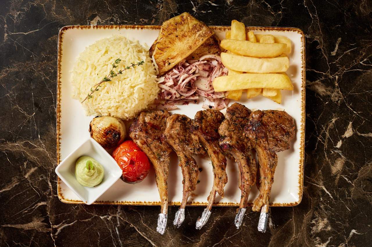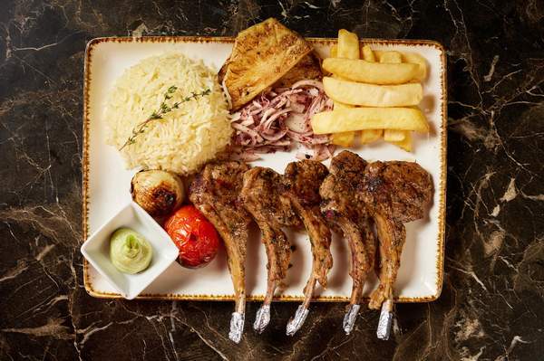 Ingrediente: carne de oaie, cartofi prajiti, hummus, legume la gratar, salata, patrunjel 300g
