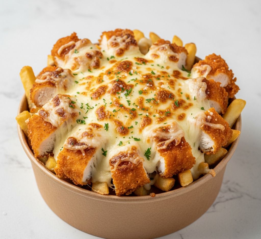 Cartofi prajiti, 4x chicken fingers, mozzarella gratinata, sos - 400g