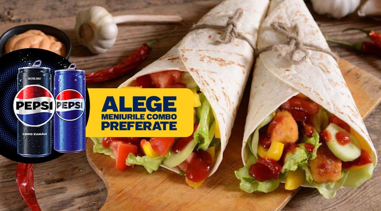 legume, cartofi, carne pui, sosuri , pepsi
