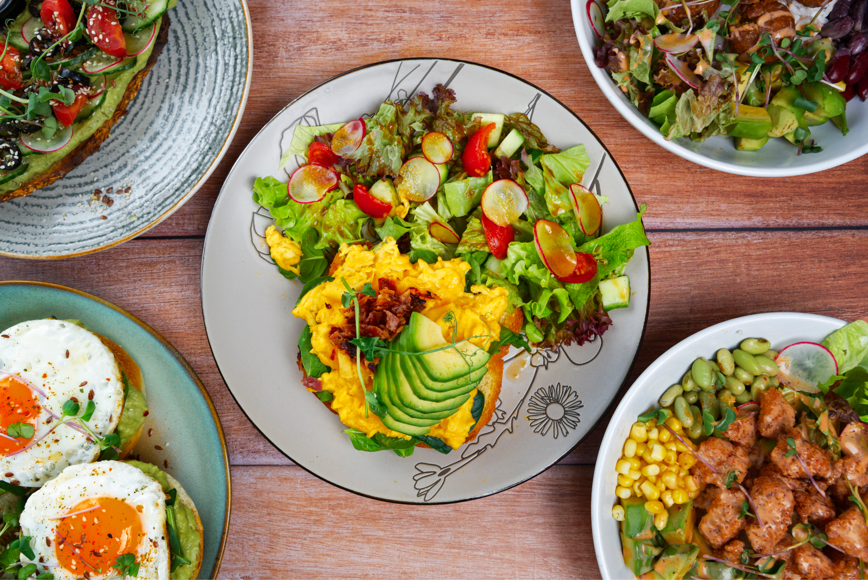 Kremasta kajgana, brioche hleb, baby spanać, hrskava slanina, avokado, mixzelenih salata