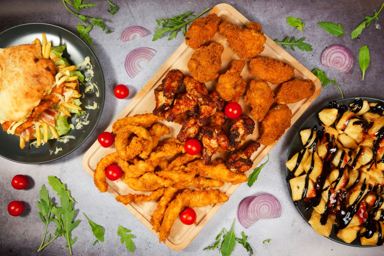 Pohovani pileći štapići 800g, pomfrit 300g, 2 domaće lepinje, BBQ sos, sweet chilli sos, majonez, kečap, chilli, 1 sos 80ml po izboru