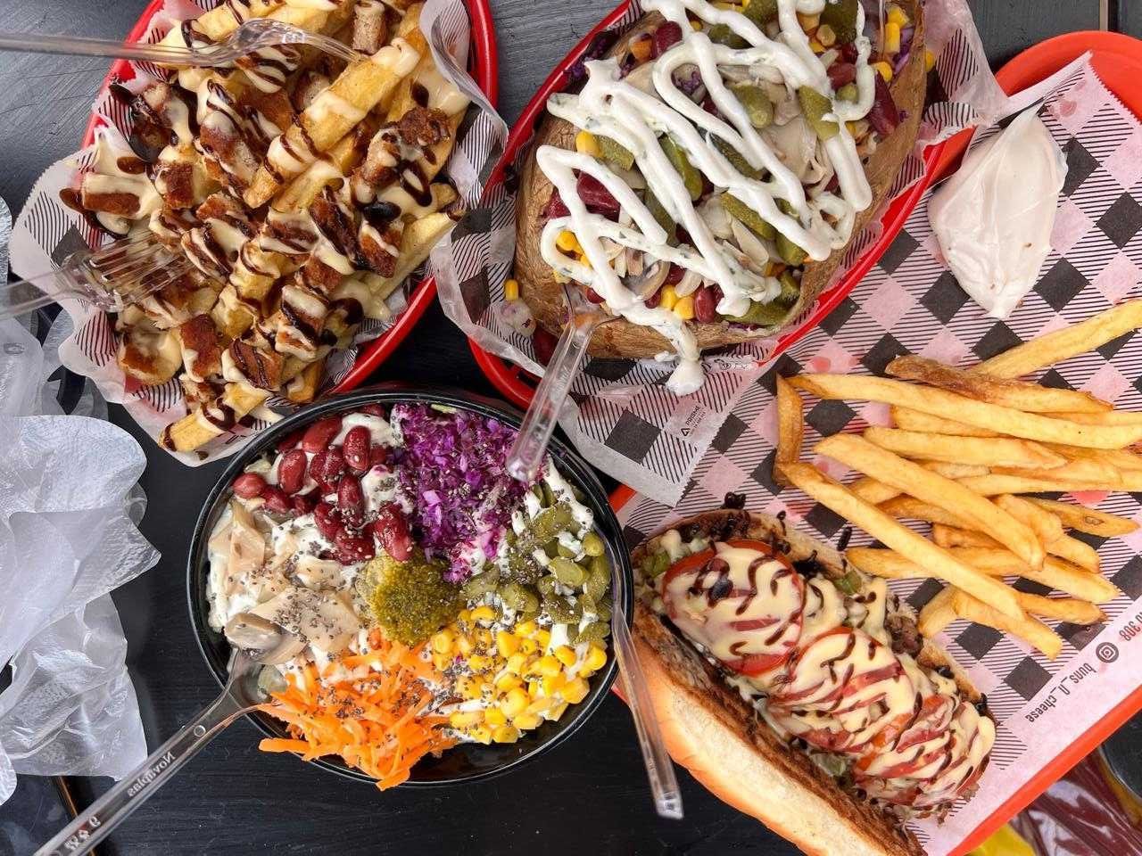 Oignon, piments sautés, double fromage, sauce mayonnaise, sauce fromagère, foie de bœuf, frites