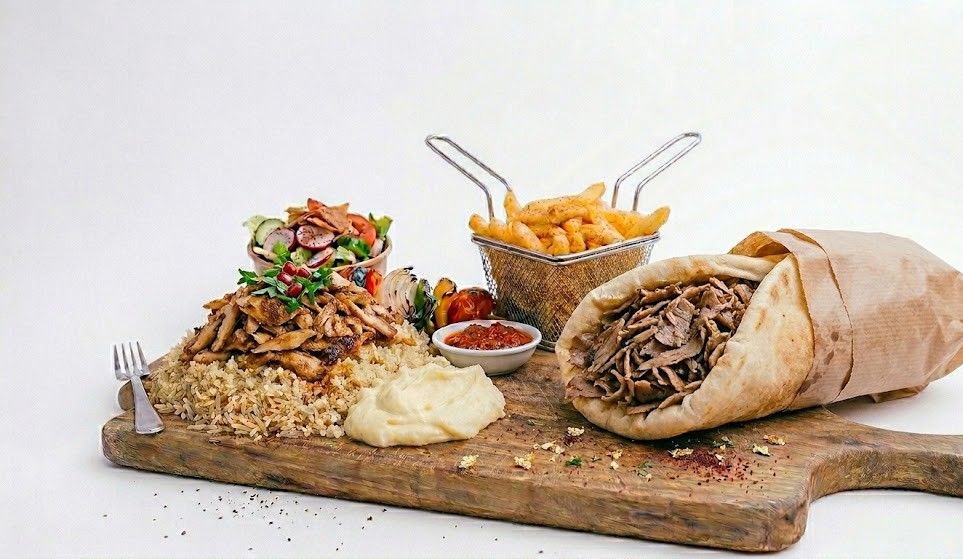 Shawarma, taboula, onion, coleslaw, thoumia, hummus, samurai sauce, fries
