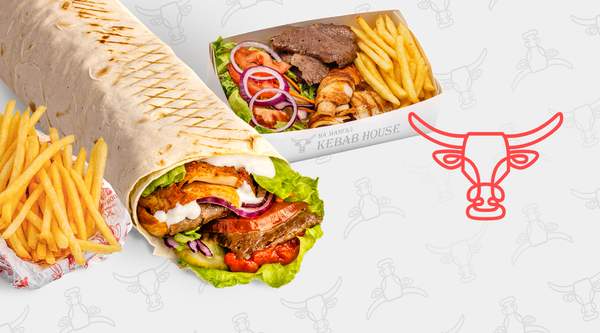 Мікс салату (айсберг, пекінка, капуста синя та морква), помідори, мариновані огірки, синя цибуля, куряче і теляче м’ясо, картопля фрі та соус на основі йогурту і часнику
