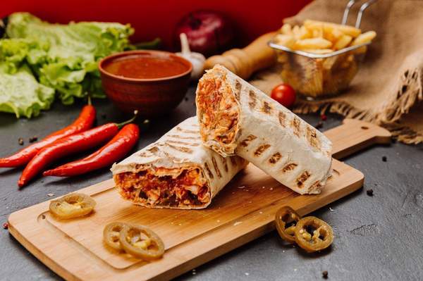 Лаваш , мʼясо курки , мисливські сосиски, цибуля, огірок, картопля фрі, кукурудза, соус часниковий.