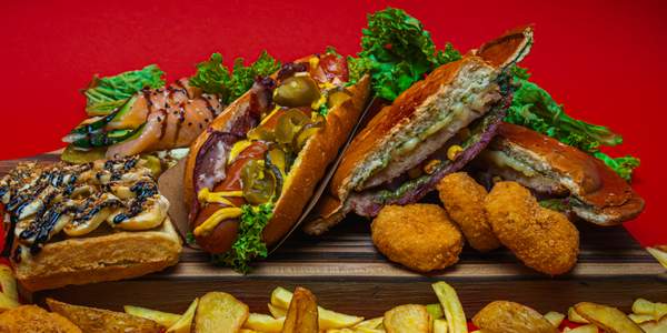 Хот-дог у булці з молочною або копченою сосискою, листям салату, беконом, маринованим огірком, томатним соусом Сальса, Кисло-солодким соусом, Американською гірчицею та перцем Халапеньйо
