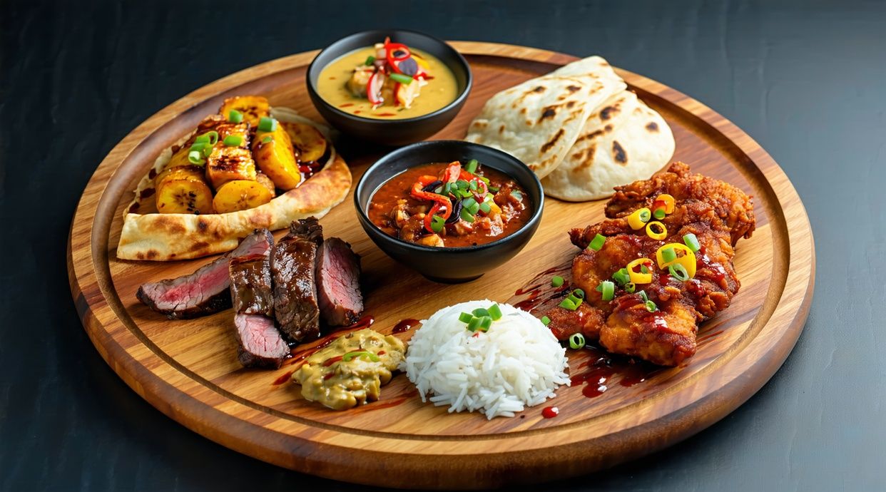 A complete meal featuring chicken or goat curry, dal, vegetables, rice, naan, salad, raita, and dessert
