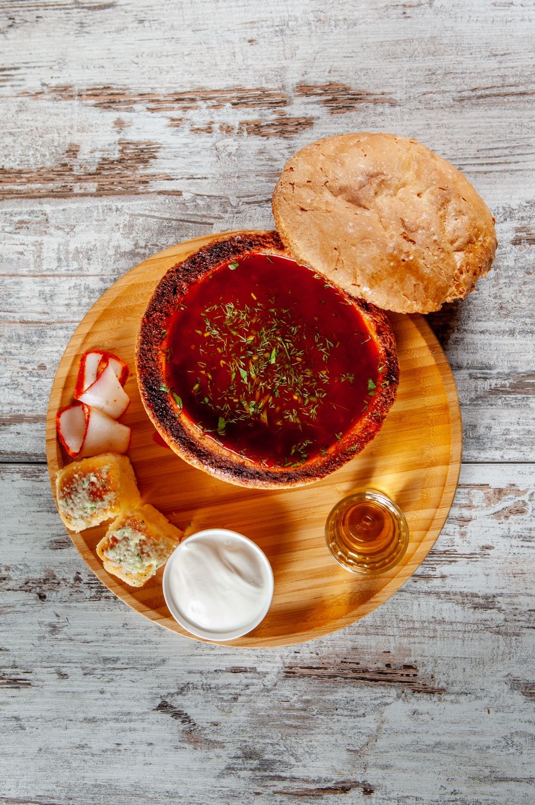 կարտոֆիլ, տավարի միս, սոխ, կանաչ ոլոռ, կծու պղպեղ, թթու վարունգ, թթվասեր