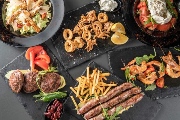 Свинско месо, картофи, домат, лук, питка, тирокафтери, горчичен сос