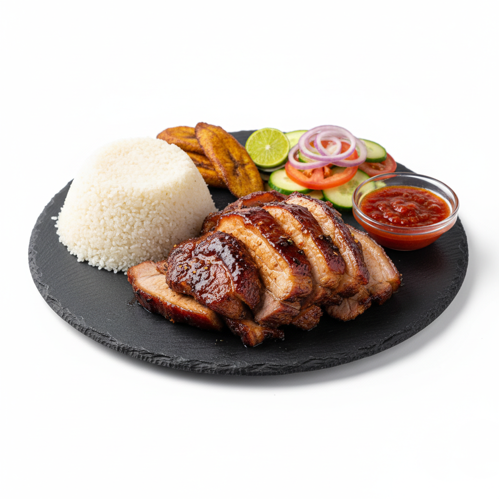 Porc rôti accompagné de semoule de manioc