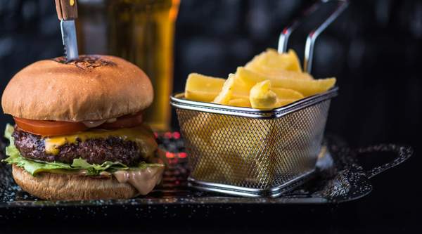 200 gr. de Carne de Ternera, Queso Cheddar, Bacon, Mushroom y salsa BBQ, con Patatas Fritas.