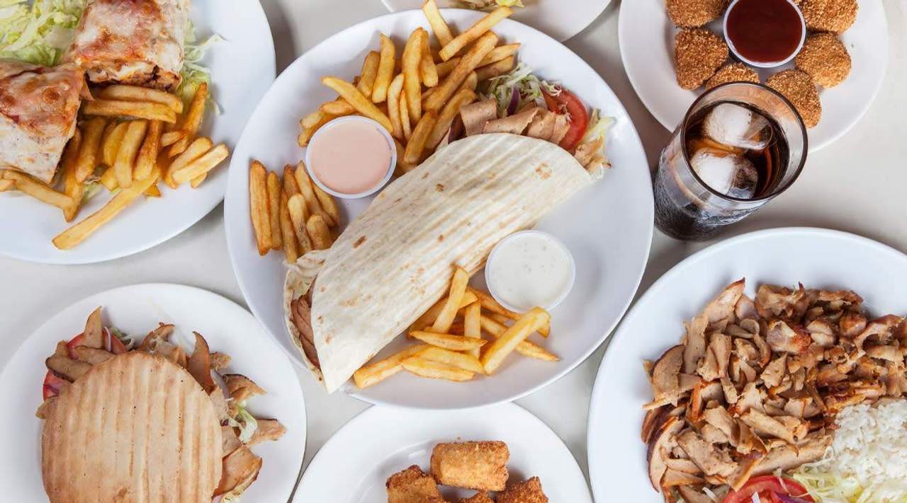 Pan tostado, ternera o pollo, patatas, queso de oveja, falafel, ensalada y salsas
