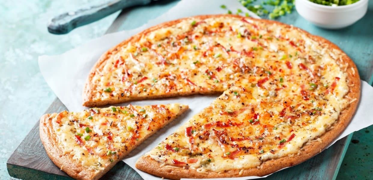 Masa fresca, salsa cremosa, mozzarella, pollo, bacón, champiñón y extra de queso.