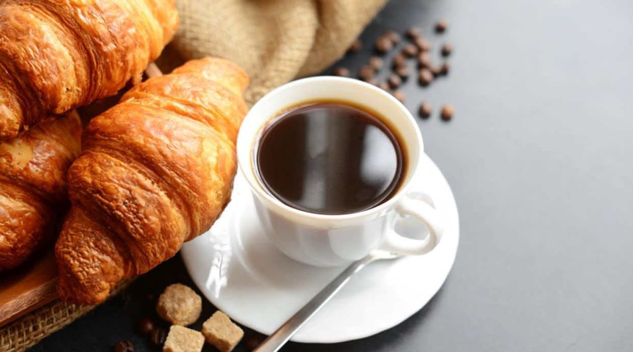 Desayuno tradicional de café, zumo natural y bollería