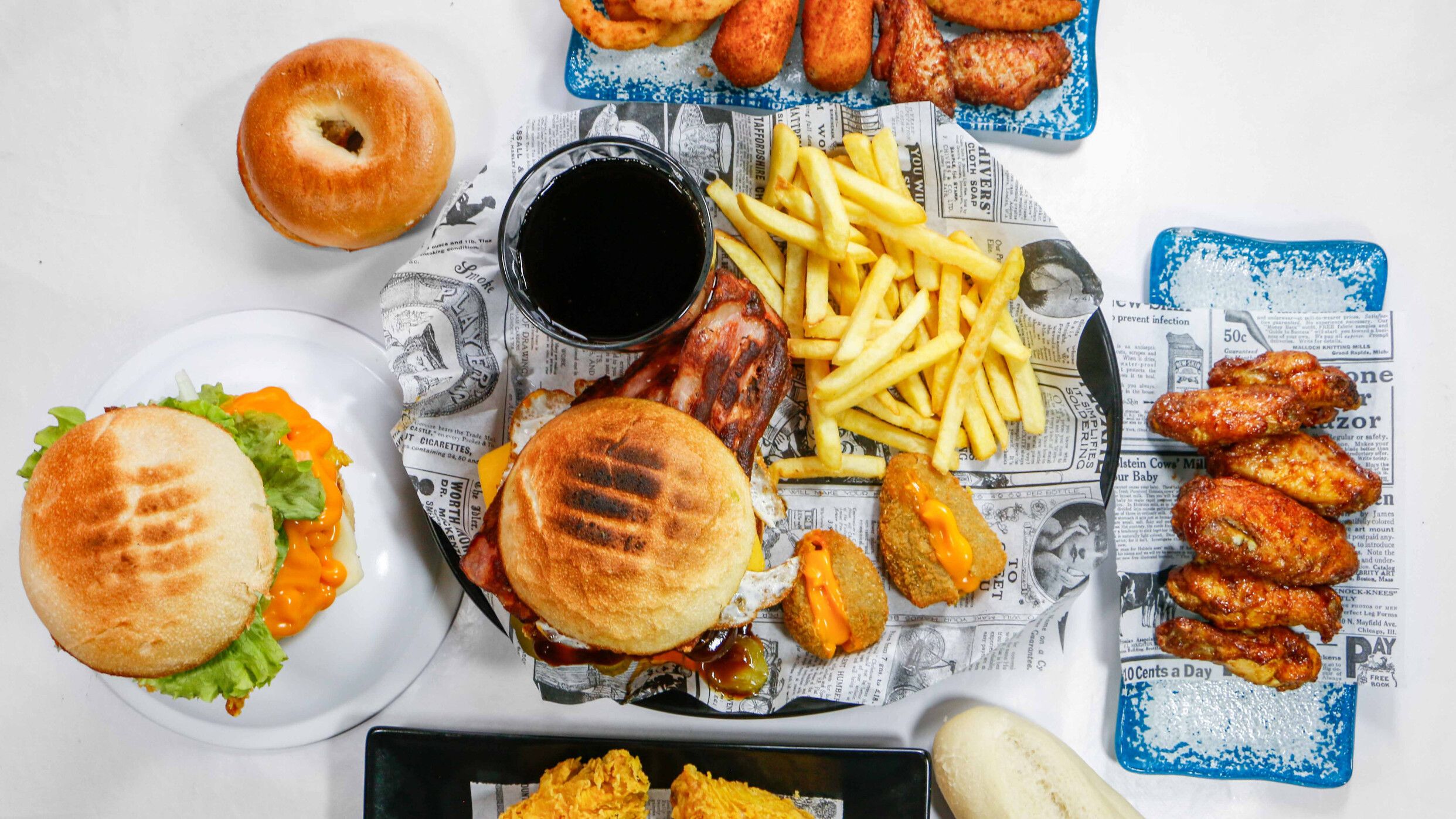 Bacon, aros de cebolla, jalapeños rellenos de queso, queso cheddar y mayonesa
