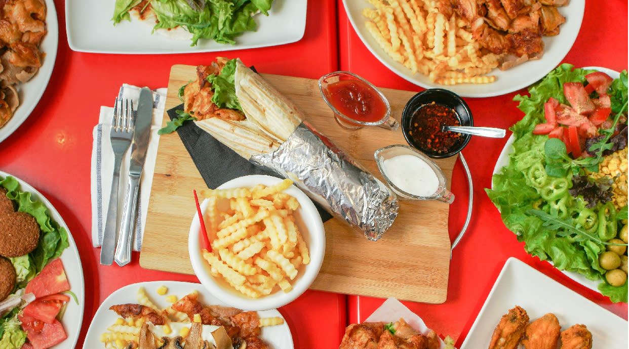 Pan, pollo, carne o mixto, arroz, lechuga, tomate, cebolla y salsa