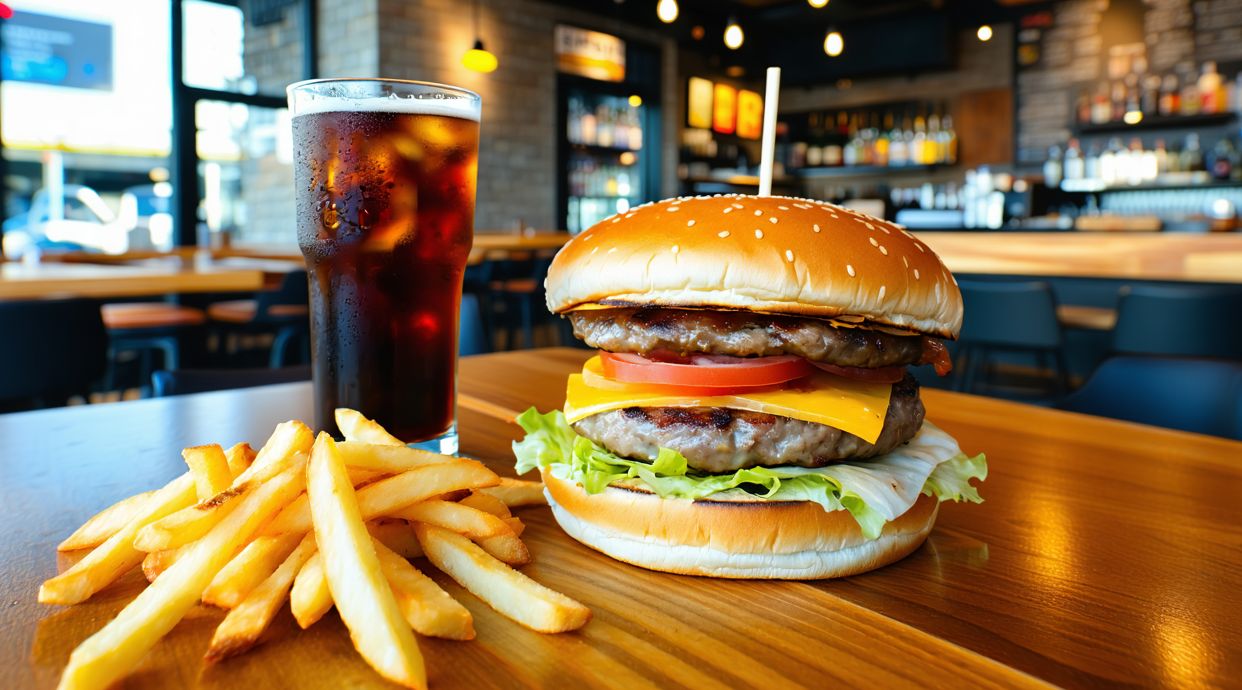 Una hamburguesa con carne de pollo, lechuga, tomate, cebolla, queso y pimientos