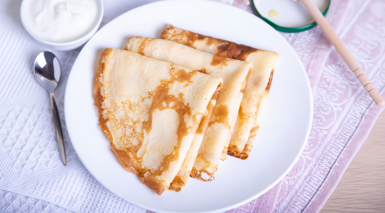 Crepe con huevo, bacon, mozzarella, crema de queso y parmesano