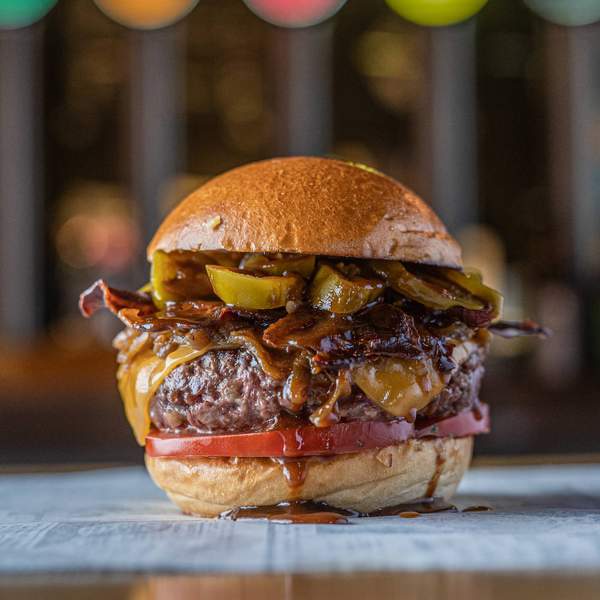 200 g de vaca vieja madurada Bacon crujientísimo Queso cheddar Crema de queso azul Salsa de bacon y queso