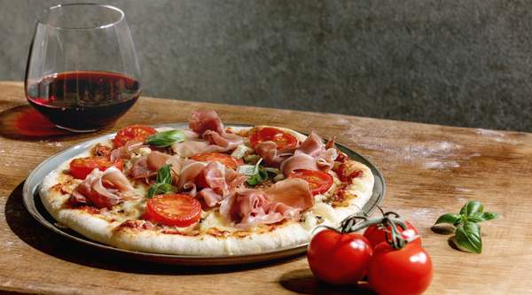 Salsa de tomate, jamón de Parma, mozzarella de bufala DOP, tomates cherry, rucula y parmesano