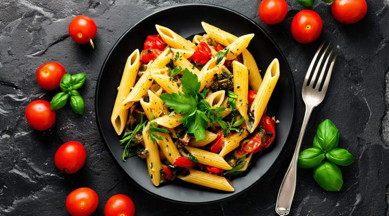 Espaguetis Nero de sepia con gulas,gambas,ajo y tomate cherry