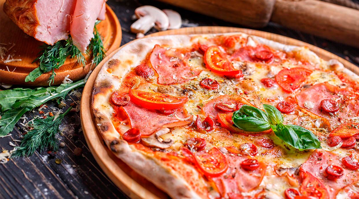 Tomate, queso mozzarella, cahmpiñones, jamón york, bacon y orégano