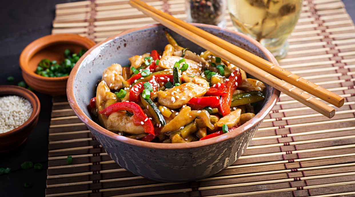 carne de pollo,pimiento,zanahoria,cebolla,calabacin,brotes de soja,