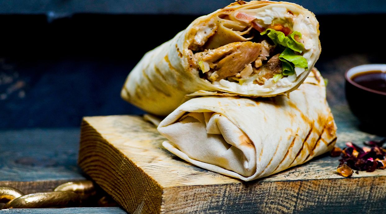 Enrollado en pan, queso de oveja, ensalada de lechuga, tomate, cebolla y salsas