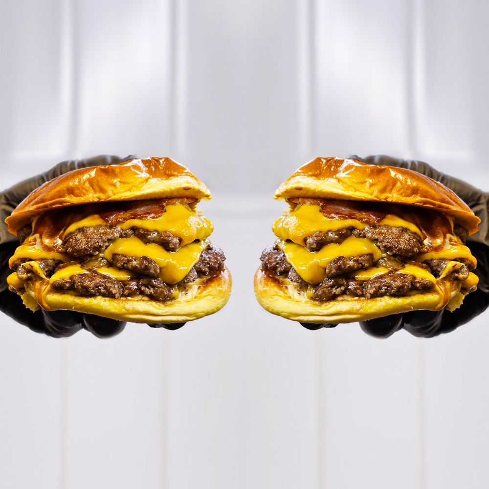 2x2 = compartir o ¿no? 4 burger de 80g de carne Limusin bañadas con crema cheddar, cebolla y bacon crunch en un pan de 55g tostado con mantequilla colmenareña. ¡Y por supuesto también patatas!