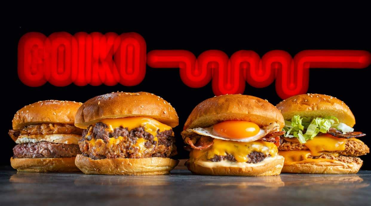 Una receta clásica de toda la vida. Hamburguesa con queso americano, cebolla morada a la plancha, tomate, lechuga, pepinillos, salsa Barbacoa Goiko y salsa Mayo Goiko. Acompañada de patatas y salsa Barbacoa Goiko.