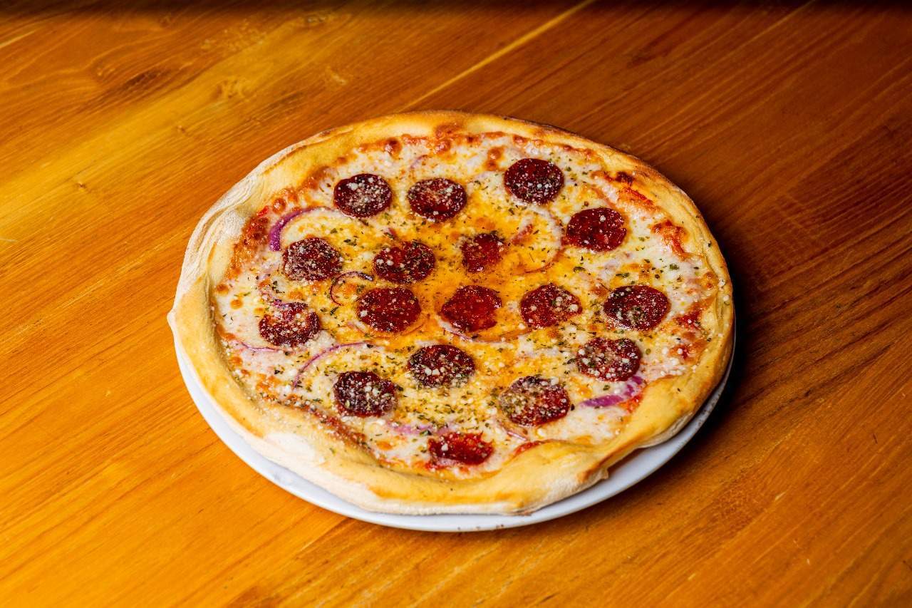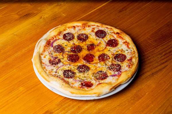 Pizza de peperoni, salsiccia picante y cebolla morada.