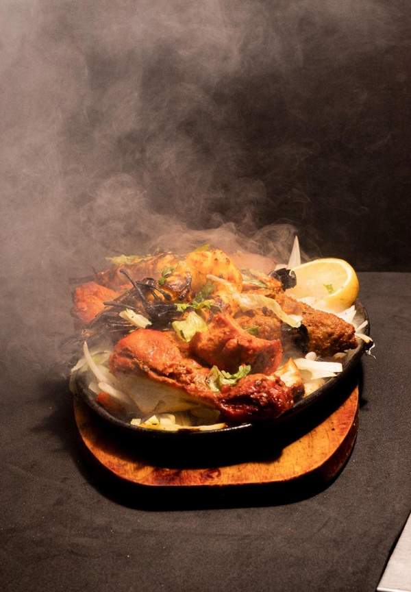 Con pollo tikka, pollo tandoori, sheekh kebab,