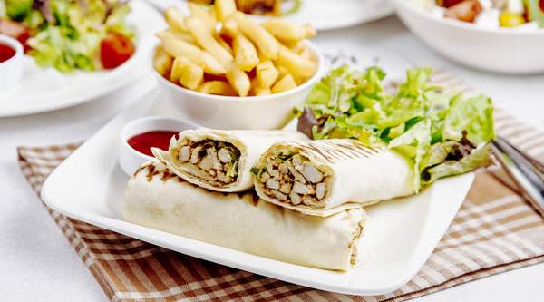 Con ensalada, patatas fritas, pollo de shawerma, salsa y pan pita
