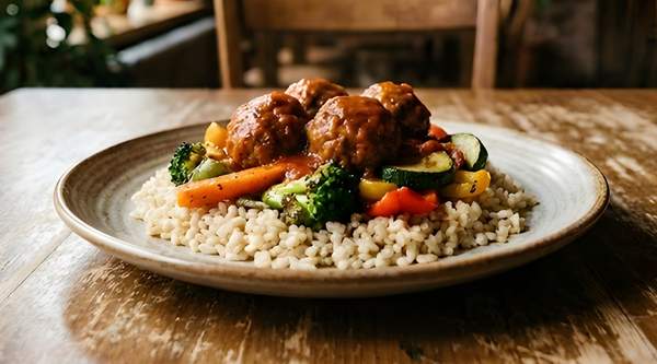 Albóndigas de Ternera con Arroz Jazmín y Verdura Asada