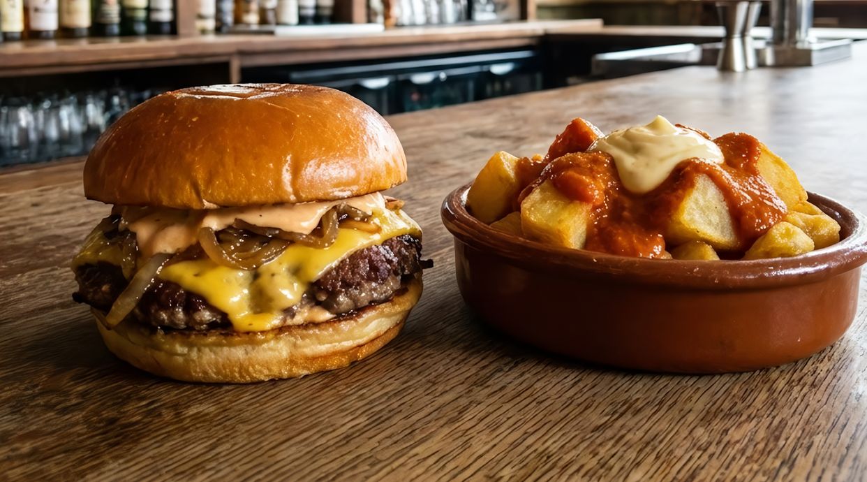 Pan high potato Doble smash de 90g al estilo lacy edge Queso gouda Rulo de cabra Cebolla caramelizada Mermelada de mango con habanero