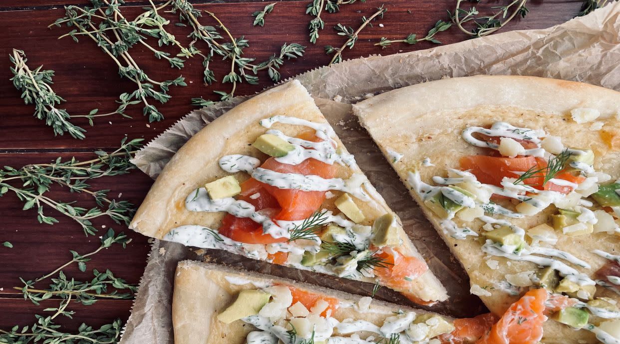 Base blanca, salsa mornay, aguacates, queso de cabra, salmón y mahonesa de eneldo
