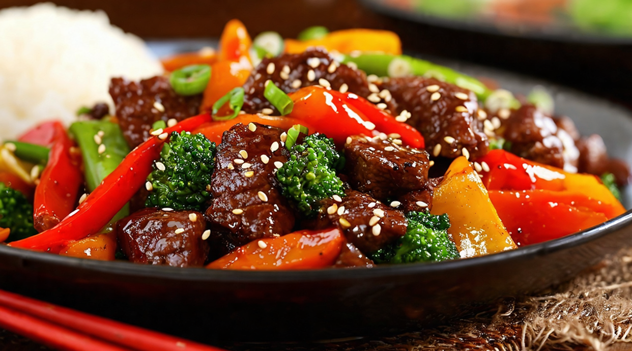 Pato salteado con salsa picante, cebolla, pimiento verde y rojo