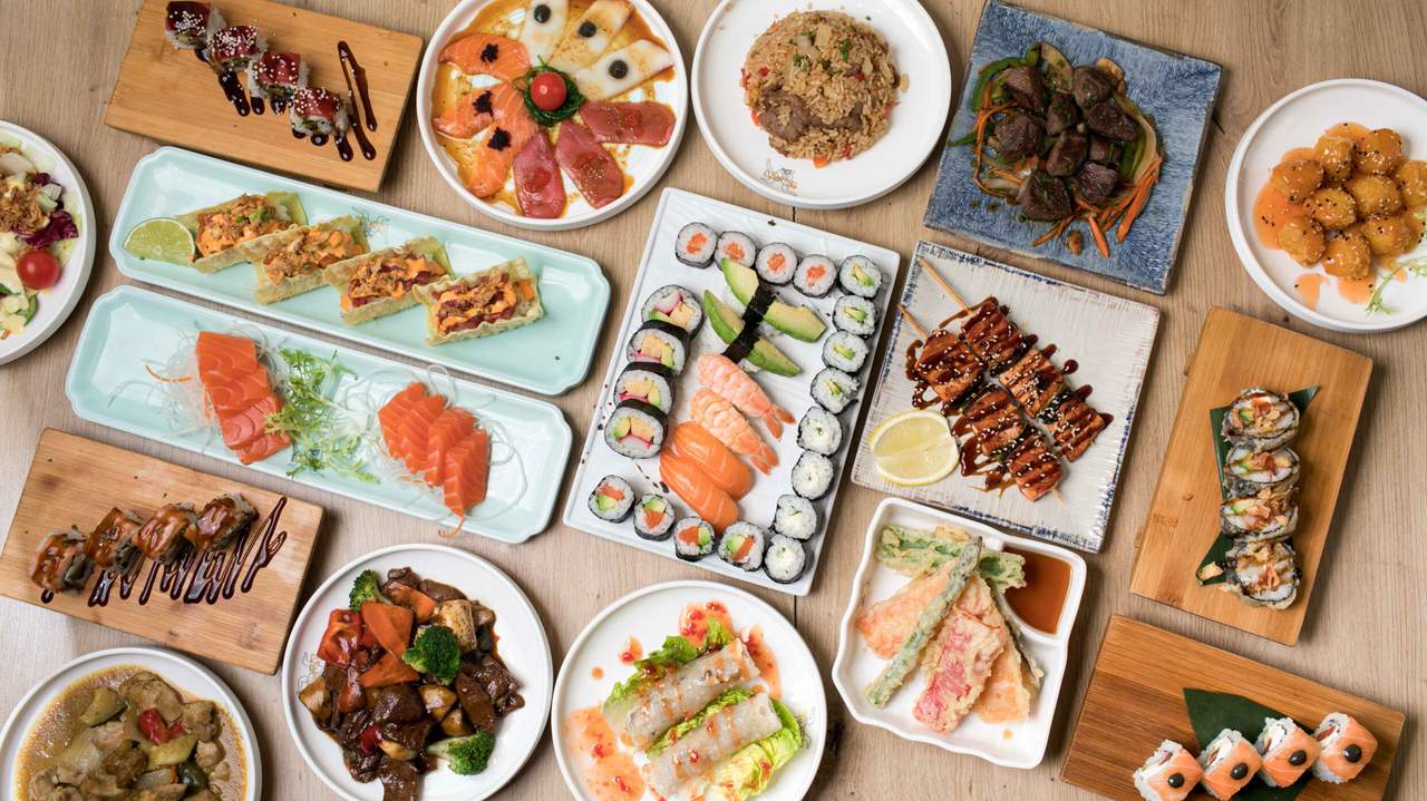 The premium tuna & salmon, con atún premium, salmón noruego, aguacate, cebolla crujiente, wakame, cherry, edamame, sésamo, mango, salsa ponzu homemade y salsa kimchi.