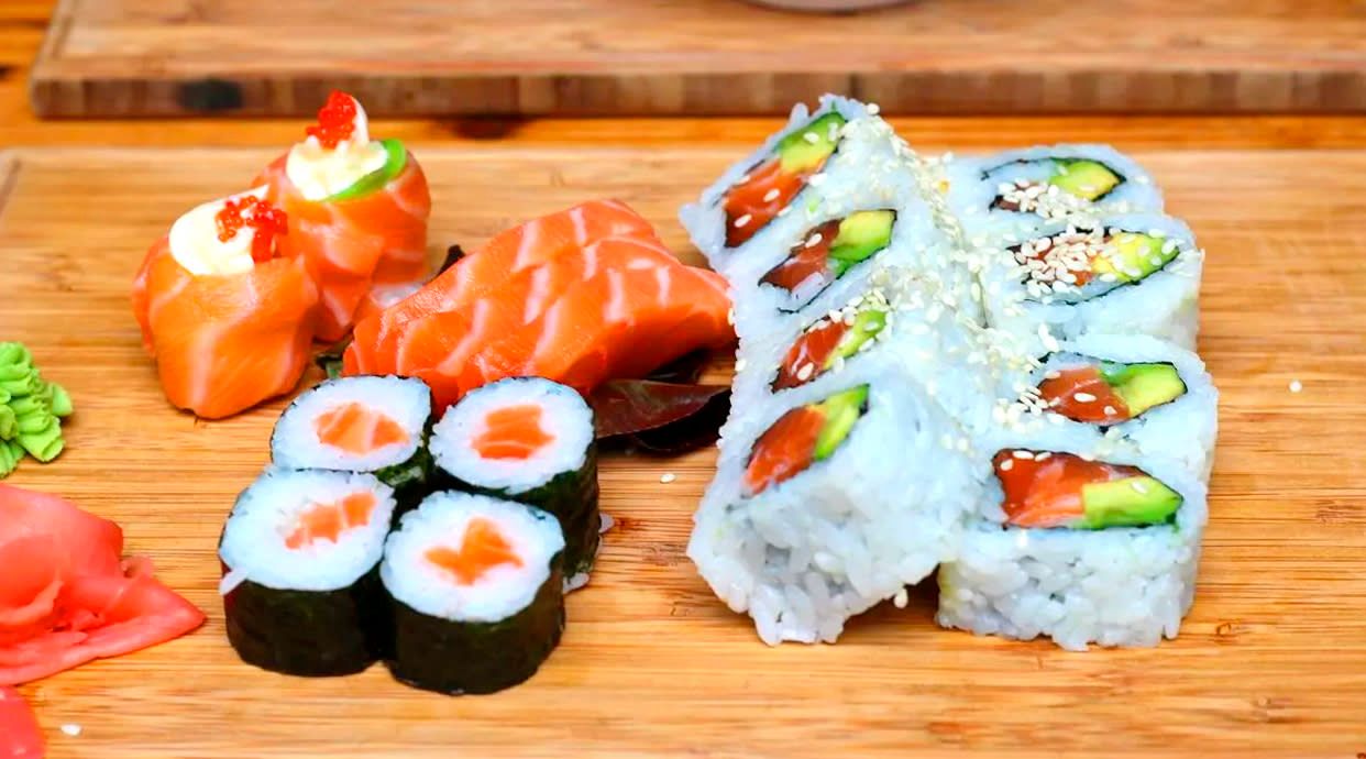 4-california surimi masago ,3-maki salmon,3-maki aguacate con queso,2-nigiri salmon