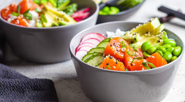 Mezclum, salmón y atún, aguacate, remolacha, zanahoria, brotes de soja, cebolla caramelizada, soja sin gluten y furikake