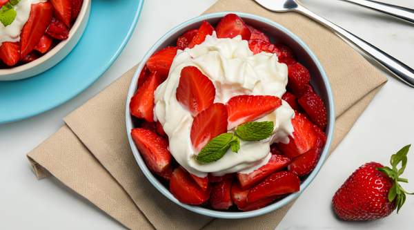 Crema de la casa, queso, dos bolas de helado, meloctón, fresa, leche condensada y sirope de mora