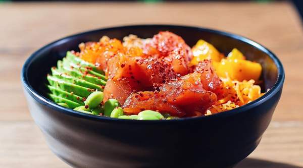 Arroz de sushi, atún marinada spicy, mango, aguacate, zanahoria, edamame, cebolla crujiente, tobiko, copos de chili y salsa origen