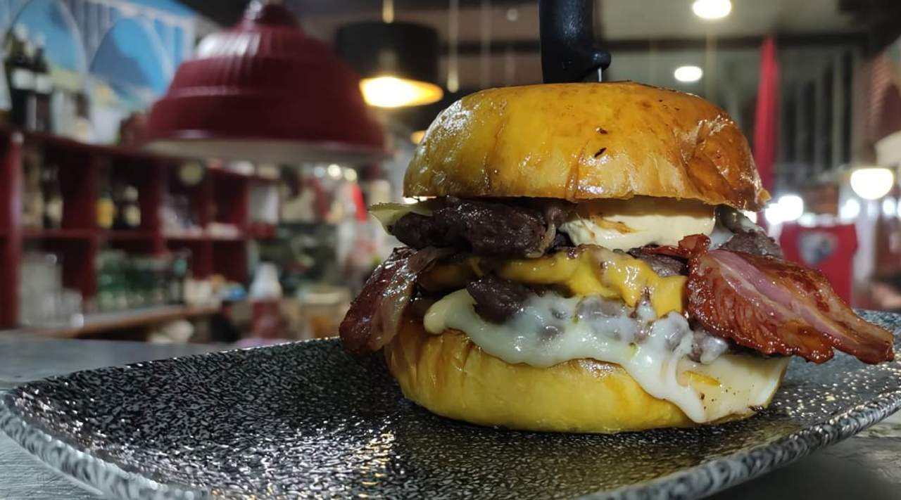Doble burger de ternera gallega, queso cheddar, bacon, lomo, lechuga de la huerta, tomate bio y cebolla frita