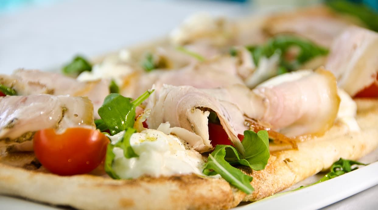 Crema de pecorino, crema de carbonara, mozzarella, guanciale, cebolla y albahaca
