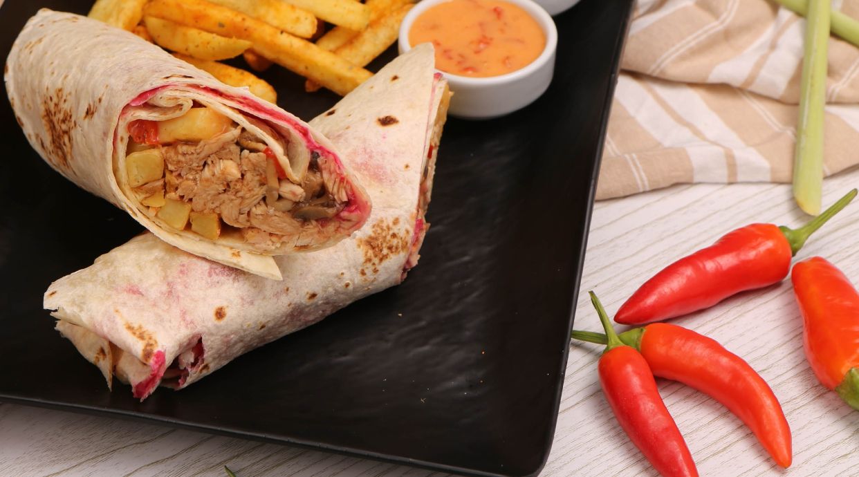 Carne pollo kebab, ensalada, patatas fritas y salsa