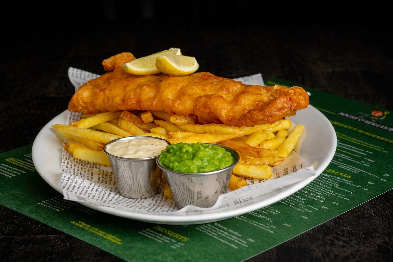 Tender & flaky cod in batter accompanied with homemade chips, peas and tartare sauce.