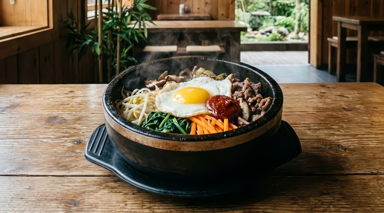 Un tazón de arroz mixto con carne sazonada, verduras variadas y un huevo frito. Un plato coreano contundente.
