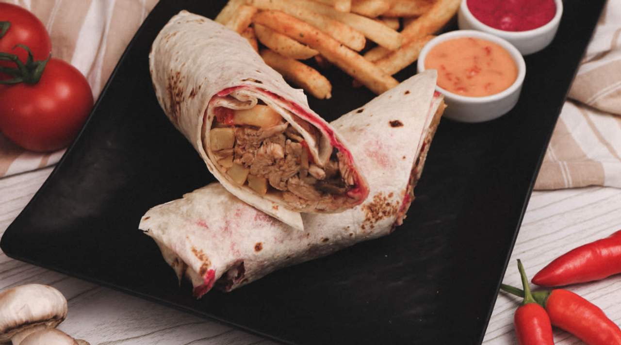 3 Durum pan enrollado con carne de ternera pollo o mixto combinado patatas y salsa de tomate y yogur
