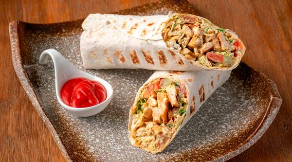 Pan enrollado con carne de pollo, ternera, o mixto con tomate, lechuga, cebolla y salsa de tomate y yogur
