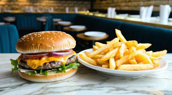 Carne de ternera (180 g.), cebolla caramelizada con morcilla desmigada, salsa tártara, queso edam, salsa de piquillo y queso crema. Acompañada de patatas fritas